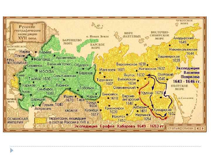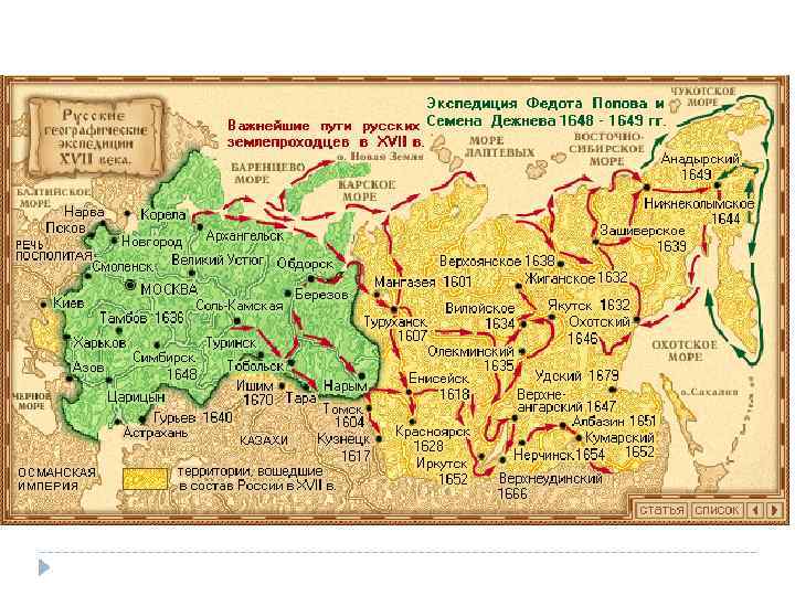 4. Освоение Сибири – Восточное направление внешней политики Покорение Сибирского ханства в конце XVI в. Проникновение в Сибирь землепроходцев и промышленников, а также представителей царской власти Создание Сибирского приказа (Сибирь 19 уездов, управляли воеводы, назначаемые из Москвы). Основание поселений и крепостей: Енисейский (1618) Красноярский (1628) Илимский (1630) Якутский (1632) иркутский (1652) Селенгинский (1665) ОСТРОГИ