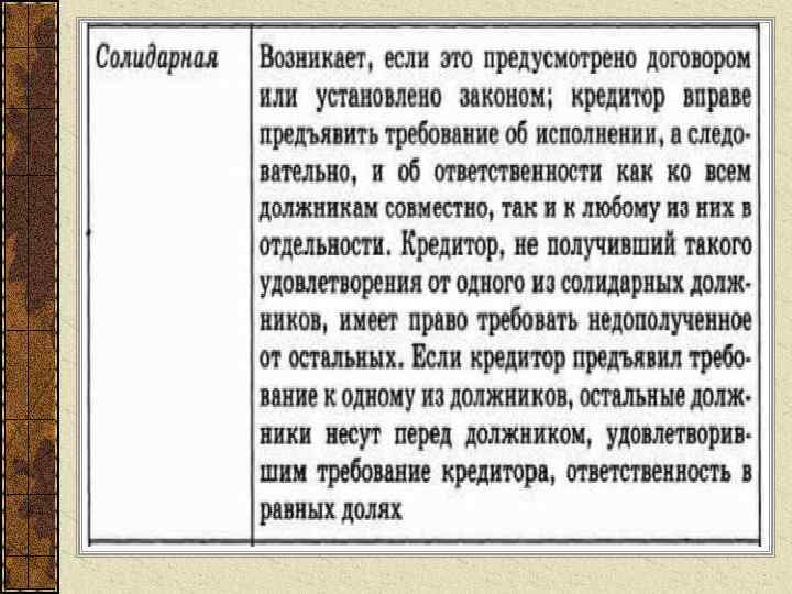 7. Гражданско-правовая ответственность, её виды Гражданско-правовая ответственность - установленные нормами гражданского права юридические последствия неисполнения или ненадлежащего исполнения лицом предусмотренных гражданским правом обязанностей, что влечет за собой нарушение субъективных гражданских прав другого лица 1. Является имущественной, поскольку гражданское право прежде всего регулирует имущественные отношения П Р И 2. Носит компенсационный характер, так как направлена на З восстановление нарушенных имущественных прав кредитора Н 3. Имеет целью принуждение должника к исполнению А возложенных на него законом или договором юридических К обязанностей И 4. Является средством предупреждения гражданских правонарушений в будущем