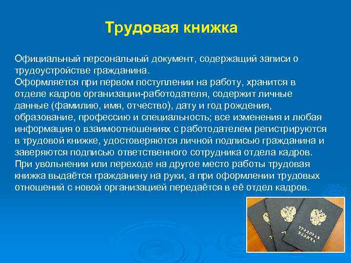 Трудовая книжка Официальный персональный документ, содержащий записи о трудоустройстве гражданина. Оформляется при первом поступлении на работу, хранится в отделе кадров организации-работодателя, содержит личные данные (фамилию, имя, отчество), дату и год рождения, образование, профессию и специальность; все изменения и любая информация о взаимоотношениях с работодателем регистрируются в трудовой книжке, удостоверяются личной подписью гражданина и заверяются подписью ответственного сотрудника отдела кадров. При увольнении или переходе на другое место работы трудовая книжка выдаётся гражданину на руки, а при оформлении трудовых отношений с новой организацией передаётся в её отдел кадров.