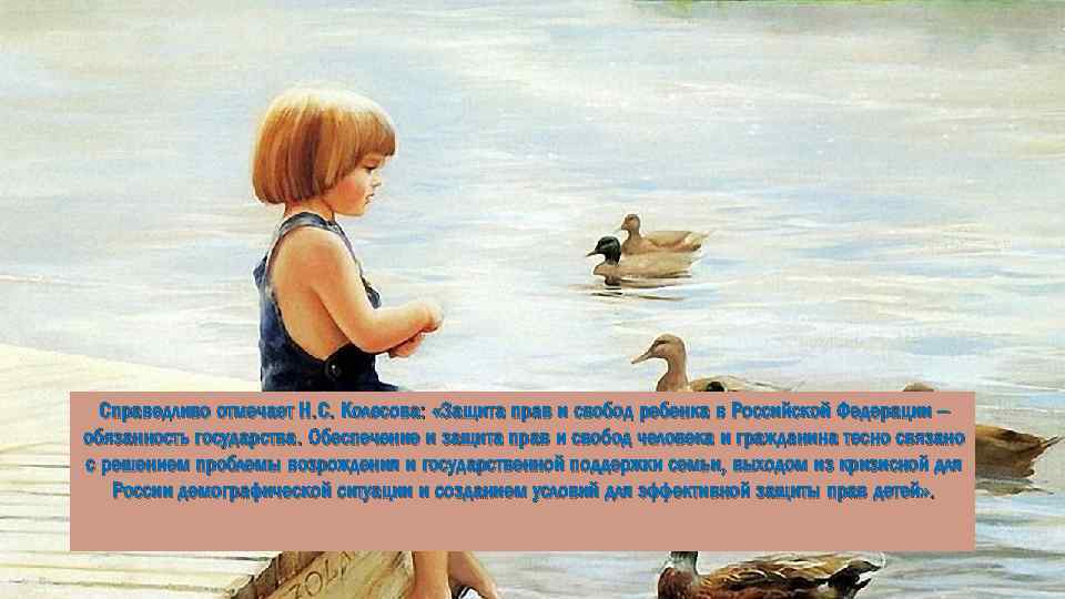 Справедливо отмечает Н. С. Колесова: «Защита прав и свобод ребенка в Российской Федерации – обязанность государства. Обеспечение и защита прав и свобод человека и гражданина тесно связано с решением проблемы возрождения и государственной поддержки семьи, выходом из кризисной для России демографической ситуации и созданием условий для эффективной защиты прав детей» .