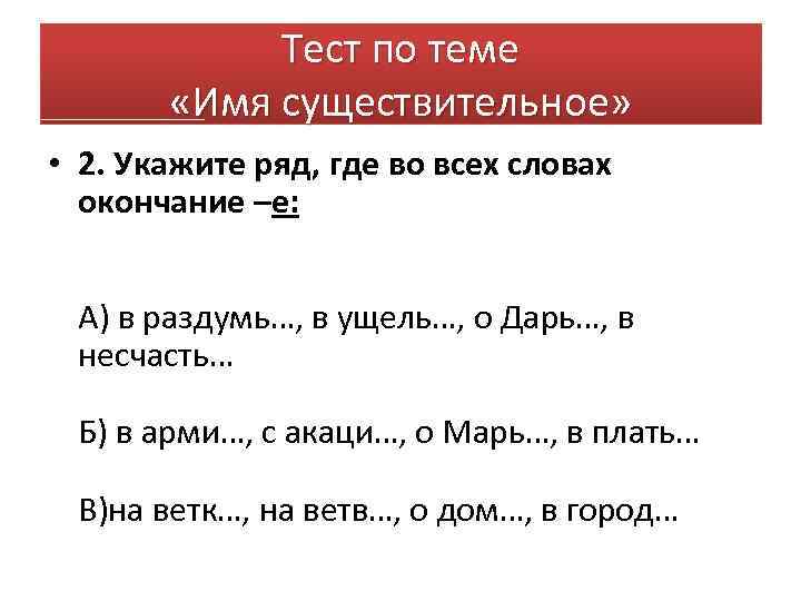 Тест по теме «Имя существительное» • 2. Укажите ряд, где во всех словах окончание –е: А) в раздумь…, в ущель…, о Дарь…, в несчасть… Б) в арми…, с акаци…, о Марь…, в плать… В)на ветк…, на ветв…, о дом…, в город…