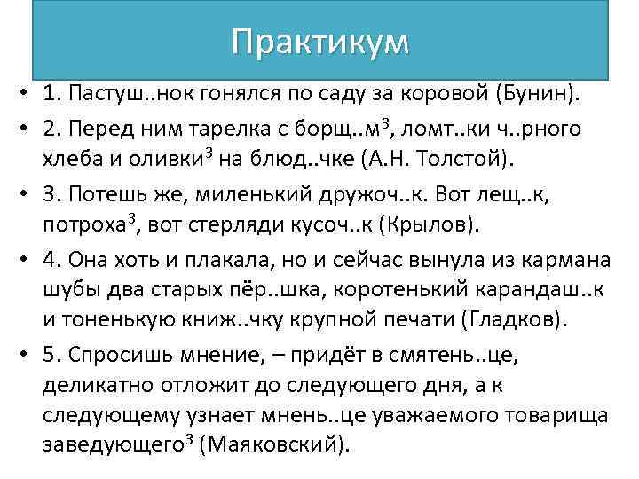 Практикум • 1. Пастуш. . нок гонялся по саду за коровой (Бунин). • 2. Перед ним тарелка с борщ. . м 3, ломт. . ки ч. . рного хлеба и оливки 3 на блюд. . чке (А. Н. Толстой). • 3. Потешь же, миленький дружоч. . к. Вот лещ. . к, потроха 3, вот стерляди кусоч. . к (Крылов). • 4. Она хоть и плакала, но и сейчас вынула из кармана шубы два старых пёр. . шка, коротенький карандаш. . к и тоненькую книж. . чку крупной печати (Гладков). • 5. Спросишь мнение, – придёт в смятень. . це, деликатно отложит до следующего дня, а к следующему узнает мнень. . це уважаемого товарища заведующего 3 (Маяковский).