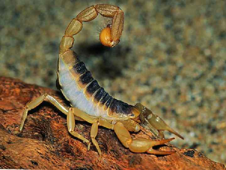 Иорданский скорпион Его прозвали смертельным охотником. В его жале содержится нейротоксичный яд, который в три раза мощнее яда кобры. За считанные минуты кровяное давление жертвы растет, температура повышается, и начинаются конвульсии (резкое непроизвольное сокращение мышц). Взрослые могут выжить, а вот дети почти всегда погибают. Заметить скорпиона можно по хвосту, но вот жала следует избегать. Возможно, такие скорпионы, обитали очень давно, они терроризировали ещё динозавров. Иорданские скорпионы обитают в Северной Африке и на ближнем востоке, но на людей они не нападают.