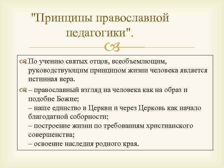 "Принципы православной педагогики". По учению святых отцов, всеобъемлющим, руководствующим принципом жизни человека является истинная вера. – православный взгляд на человека как на образ и подобие Божие; – наше единство в Церкви и через Церковь как начало благодатной соборности; – построение жизни по требованиям христианского совершенства; – освоение наследия родного края.