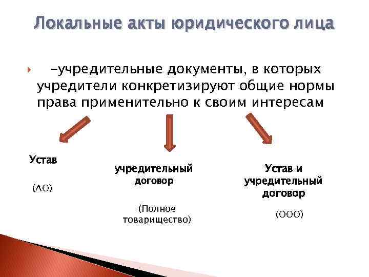 Локальные акты юридического лица -учредительные документы, в которых учредители конкретизируют общие нормы права применительно к своим интересам Устав (АО) учредительный договор (Полное товарищество) Устав и учредительный договор (ООО)