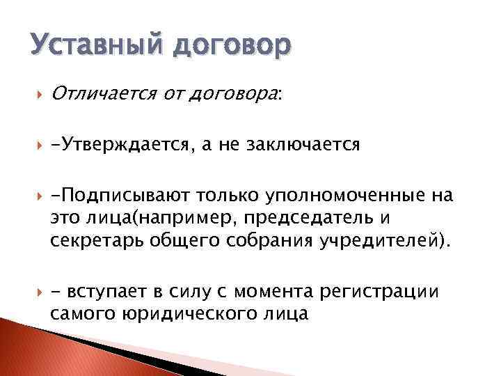 Уставный договор Отличается от договора: -Утверждается, а не заключается -Подписывают только уполномоченные на это лица(например, председатель и секретарь общего собрания учредителей). - вступает в силу с момента регистрации самого юридического лица