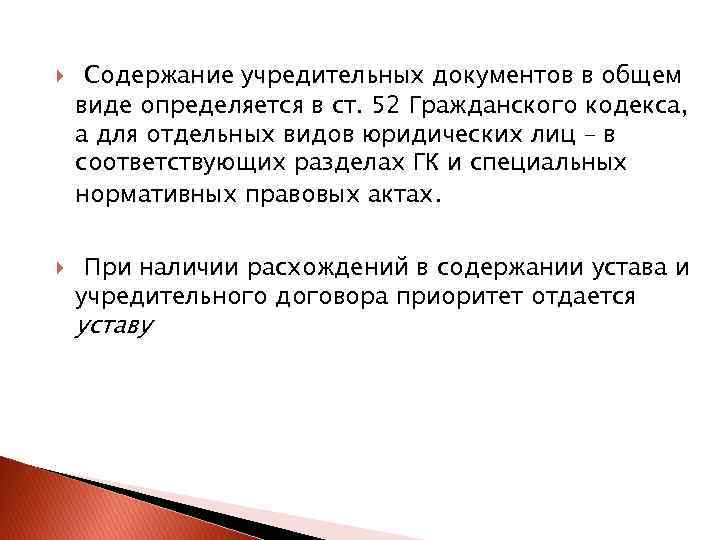 Содержание учредительных документов в общем виде определяется в ст. 52 Гражданского кодекса, а для отдельных видов юридических лиц – в соответствующих разделах ГК и специальных нормативных правовых актах. При наличии расхождений в содержании устава и учредительного договора приоритет отдается уставу