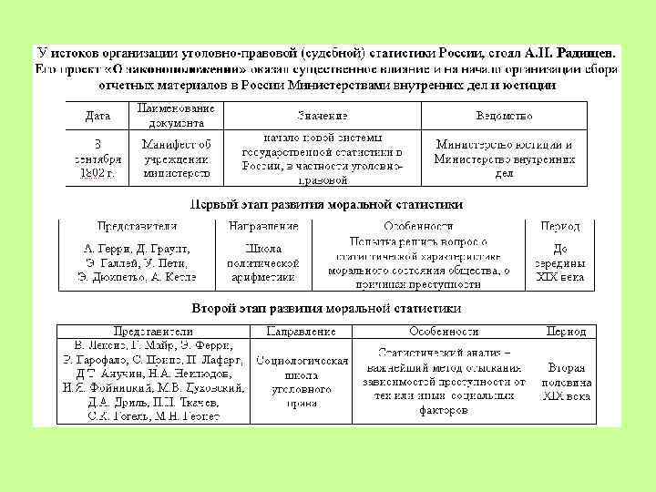 А. Н. Радищев в работе «О законоположении» (1802 г. ) не просто констатировал печальные тенденции преступности, а предложил основные направления использования статистических закономерностей в правотворческой работе. Решение этого вопроса он видел в необходимой организации статистического наблюдения (т. е. учета и отчетности) за правовым и экономическим положением России во всех губерниях и присутственных местах