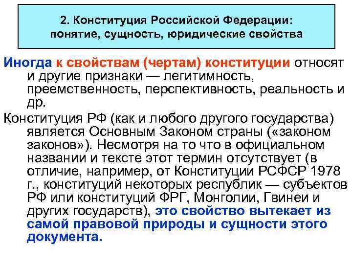 2. Конституция Российской Федерации: понятие, сущность, юридические свойства Иногда к свойствам (чертам) конституции относят и другие признаки — легитимность, преемственность, перспективность, реальность и др. Конституция РФ (как и любого другого государства) является Основным Законом страны ( «законом законов» ). Несмотря на то что в официальном названии и тексте этот термин отсутствует (в отличие, например, от Конституции РСФСР 1978 г. , конституций некоторых республик — субъектов РФ или конституций ФРГ, Монголии, Гвинеи и других государств), это свойство вытекает из самой правовой природы и сущности этого документа.