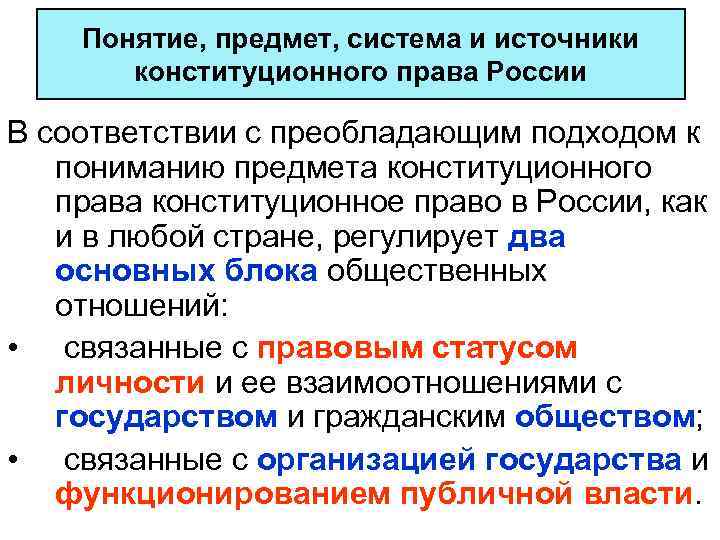 Понятие, предмет, система и источники конституционного права России В соответствии с преобладающим подходом к пониманию предмета конституционного права конституционное право в России, как и в любой стране, регулирует два основных блока общественных отношений: • связанные с правовым статусом личности и ее взаимоотношениями с государством и гражданским обществом; • связанные с организацией государства и функционированием публичной власти.