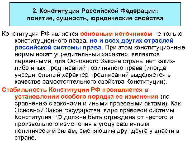 2. Конституция Российской Федерации: понятие, сущность, юридические свойства Конституция РФ является основным источником не только конституционного права, но и всех других отраслей российской системы права. При этом конституционные нормы носят учредительный характер, являются первичными, для Основного Закона страны нет каких- либо иных предписаний позитивного права (иногда учредительный характер предписаний выделяется в качестве самостоятельного свойства Конституции). Стабильность Конституции РФ проявляется в установлении особого порядка ее изменения (по сравнению с законами и иными правовыми актами). Как Основной Закон государства, ядро правовой системы Конституция РФ должна быть ограждена от частого и произвольного изменения в угоду различным политическим силам, сменяющим друга у власти в стране.