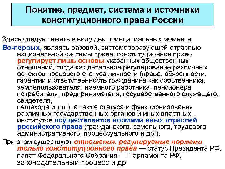 Понятие, предмет, система и источники конституционного права России Здесь следует иметь в виду два принципиальных момента. Во-первых, являясь базовой, системообразующей отраслью национальной системы права, конституционное право регулирует лишь основы указанных общественных отношений, тогда как детальное регулирование различных аспектов правового статуса личности (права, обязанности, гарантии и ответственность гражданина как собственника, землепользователя, наемного работника, пенсионера, потребителя, предпринимателя, государственного служащего, свидетеля, пешехода и т. п. ), а также статуса и функционирования различных государственных органов и иных властных институтов осуществляется нормами иных отраслей российского права (гражданского, земельного, трудового, административного, процессуального и др. ). При этом существуют отношения, регулируемые нормами только конституционного права — статус Президента РФ, палат Федерального Собрания — Парламента РФ, законодательный процесс и др.