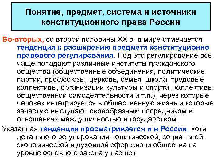 Понятие, предмет, система и источники конституционного права России Во-вторых, со второй половины XX в. в мире отмечается тенденция к расширению предмета конституционно правового регулирования. Под это регулирование все чаще попадают различные институты гражданского общества (общественные объединения, политические партии, профсоюзы, церковь, семья, школа, трудовые коллективы, организации культуры и спорта, коллективы общественной самодеятельности и т. п. ), через которые человек интегрируется в общественную жизнь и которые зачастую выступают своеобразным посредником в отношениях между личностью и государством. Указанная тенденция просматривается и в России, хотя детального регулирования политической, социальной, экономической и духовной сфер жизни общества на уровне основного закона у нас нет.