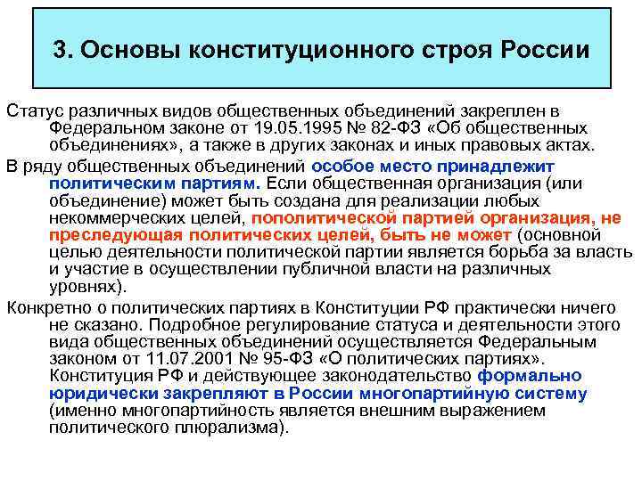 3. Основы конституционного строя России Статус различных видов общественных объединений закреплен в Федеральном законе от 19. 05. 1995 № 82 -ФЗ «Об общественных объединениях» , а также в других законах и иных правовых актах. В ряду общественных объединений особое место принадлежит политическим партиям. Если общественная организация (или объединение) может быть создана для реализации любых некоммерческих целей, пополитической партией организация, не преследующая политических целей, быть не может (основной целью деятельности политической партии является борьба за власть и участие в осуществлении публичной власти на различных уровнях). Конкретно о политических партиях в Конституции РФ практически ничего не сказано. Подробное регулирование статуса и деятельности этого вида общественных объединений осуществляется Федеральным законом от 11. 07. 2001 № 95 -ФЗ «О политических партиях» . Конституция РФ и действующее законодательство формально юридически закрепляют в России многопартийную систему (именно многопартийность является внешним выражением политического плюрализма).