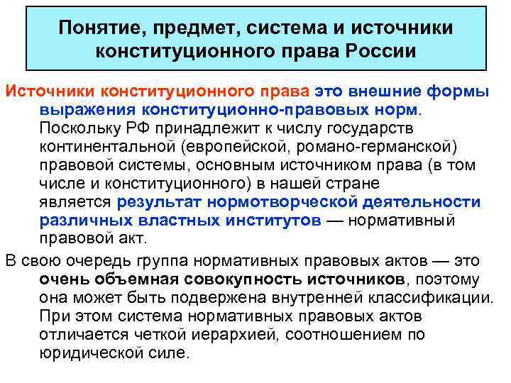 Понятие, предмет, система и источники конституционного права России Источники конституционного права это внешние формы выражения конституционно-правовых норм. Поскольку РФ принадлежит к числу государств континентальной (европейской, романо-германской) правовой системы, основным источником права (в том числе и конституционного) в нашей стране является результат нормотворческой деятельности различных властных институтов — нормативный правовой акт. В свою очередь группа нормативных правовых актов — это очень объемная совокупность источников, поэтому она может быть подвержена внутренней классификации. При этом система нормативных правовых актов отличается четкой иерархией, соотношением по юридической силе.