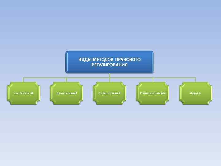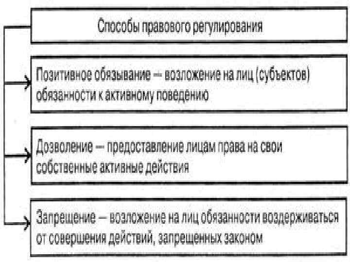 Метод правового регулирования представляет собой совокупность различных приемов и способов правового воздействия (регулирования) отрасли права на общественные отношения, являющиеся предметом ее регулирования. Метод правового регулирования определенной отрасли права складывается из комбинации пяти способов воздействия на общественные отношения: обязываний, запретов, дозволений, поощрений, рекомендаций. Их сочетание и образует два основных (императивный и диспозитивный) и два дополнительных (поощрительный и рекомендательный) способа воздействия на поведение субъекта (точка зрения профессора В. К. Бабаева). К дозволениям тяготеет гражданское право, к запрещениям – уголовное право, к обязываниям - административное право. Применение того или иного метода правового регулирования зависит от: содержания общественных отношений, усмотрения законодателя, сложившейся правоприменительной практики, уровня правовой культуры населения. Методы могут применяться как самостоятельно, так и в совокупности, во взаимодействии.