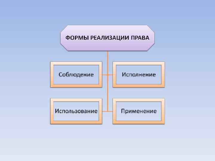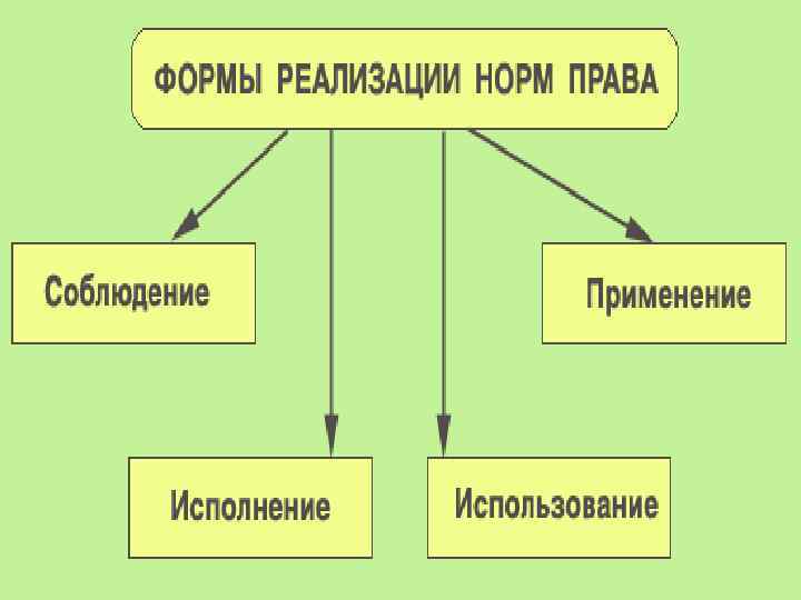 Реализация права – это процесс воплощения правовых предписаний в поведении субъектов права К формам реализации права относятся: 1. Соблюдение норм права – это такая форма их реализации, которая заключается в воздержании субъекта права от совершения запрещенных правом деяний. Иначе говоря, это пассивная форма поведения субъекта права. Примером может служить правовое предписание, обязывающее граждан не нарушать правил уличного движения. 2. Исполнение норм права – это такая форма их реализации, которая требует активного поведения субъекта права по осуществлению возложенных на него обязанностей. Так, согласно трудовому законодательству, администрация предприятий, организаций обязана предоставлять всем рабочим и служащим ежегодные отпуска с сохранением места работы (должности) и среднего заработка. 3. Использование норм права представляет собой такую форму их реализации, когда участники правоотношений по своему усмотрению реализуют принадлежащие им права. Примером такой формы реализации права является право на образование, которое реализуется субъектами права. 4. Применение норм права – это форма их реализации, осуществляемая государством в лице своих органов применительно к конкретным случаям жизни. Например, в соответствии с нормами уголовного права суд выносит приговор подсудимому за совершение им преступления.