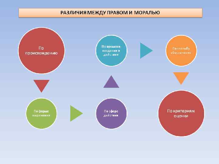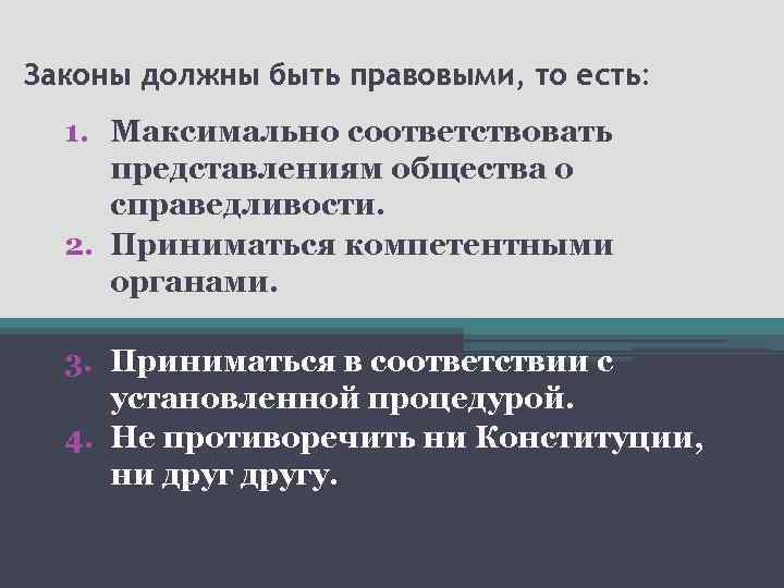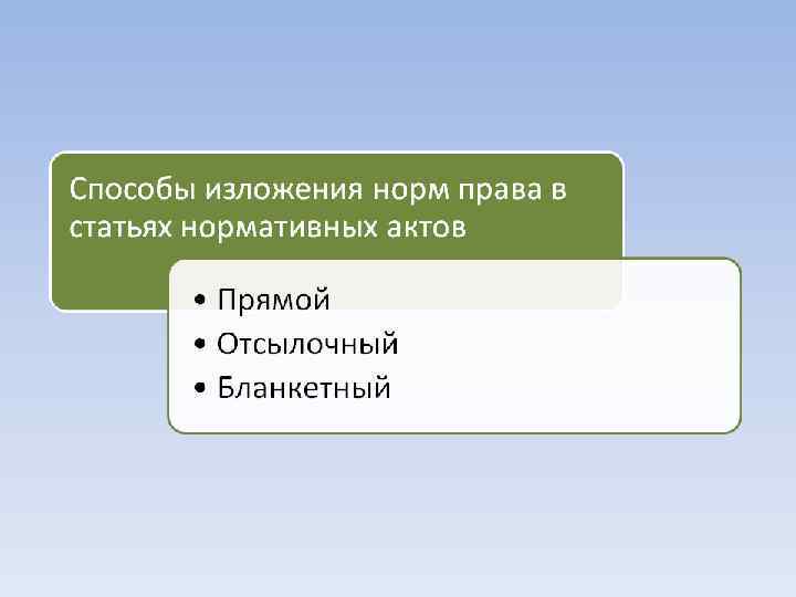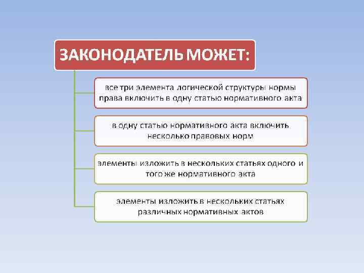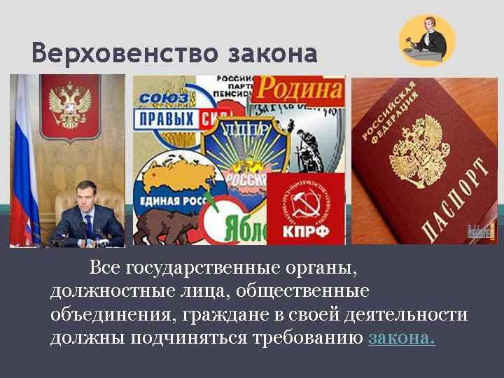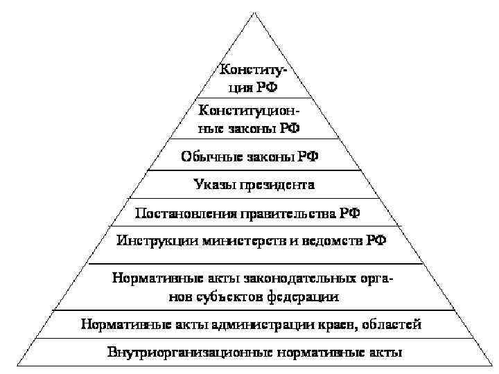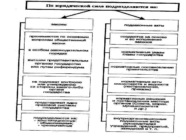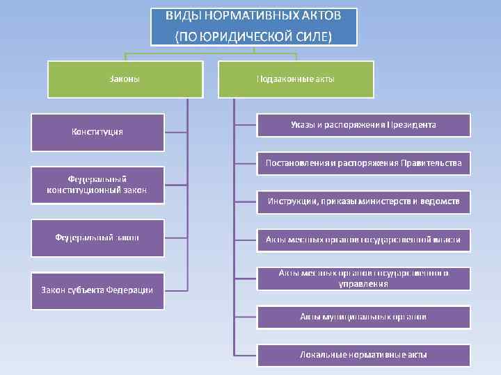 СООТНОШЕНИЕ ПРАВА И ЗАКОНА Право и закон — это взаимосвязанные, но различные понятия. В целом «право» шире, чем «закон» . Отличия здесь таковы: 1) закон — не единственный вид нормативных актов, к числу которых относятся и указы, и постановления, и инструкции, и корпоративные акты; 2) помимо нормативных актов, нормы права могут содержаться в судебных решениях (прецеденты), обычаях, договорах.