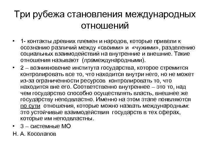 Три рубежа становления международных отношений • 1 - контакты древних племен и народов, которые привели к осознанию различий между «своими» и «чужими» , разделению социальных взаимодействий на внутренние и внешние. Такие отношения называют (прамеждународными). • 2 – возникновение института государства, которое стремится контролировать все то, что находится внутри него, но не может из-за ограниченности ресурсов контролировать то, что находится вне его. Соответственно внутреннее – это то, над чем государство способно осуществлять власть, внешнее же государству неподвластно. Именно на этом этапе появляются по сути отношения, которые можно назвать международным: это устойчивые взаимодействия государств в тех сферах, которые им неподвластны. • 3 – системные МО Н. А. Косолапов