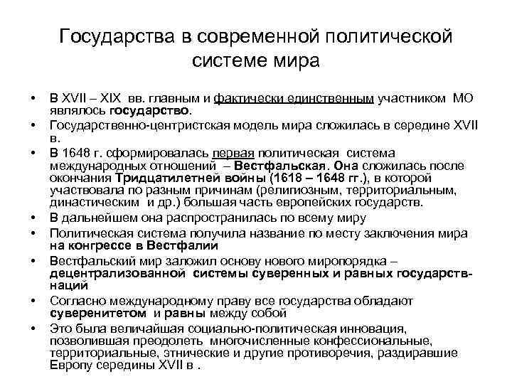 Государства в современной политической системе мира • • В XVII – XIX вв. главным и фактически единственным участником МО являлось государство. Государственно-центристская модель мира сложилась в середине XVII в. В 1648 г. сформировалась первая политическая система международных отношений – Вестфальская. Она сложилась после окончания Тридцатилетней войны (1618 – 1648 гг. ), в которой участвовала по разным причинам (религиозным, территориальным, династическим и др. ) большая часть европейских государств. В дальнейшем она распространилась по всему миру Политическая система получила название по месту заключения мира на конгрессе в Вестфалии Вестфальский мир заложил основу нового миропорядка – децентрализованной системы суверенных и равных государствнаций Согласно международному праву все государства обладают суверенитетом и равны между собой Это была величайшая социально-политическая инновация, позволившая преодолеть многочисленные конфессиональные, территориальные, этнические и другие противоречия, раздиравшие Европу середины XVII в.