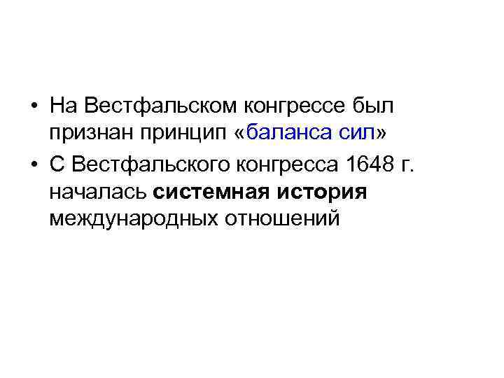 • На Вестфальском конгрессе был признан принцип «баланса сил» • С Вестфальского конгресса 1648 г. началась системная история международных отношений