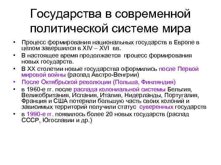 Государства в современной политической системе мира • Процесс формирования национальных государств в Европе в целом завершился в XIV – XVI вв. • В настоящее время продолжается процесс формирования новых государств. • В ХХ столетии новые государства оформились после Первой мировой войны (распад Австро-Венгрии) • После Октябрьской революции (Польша, Финляндия) • в 1960 -е гг. после распада колониальной системы Бельгия, Великобритания, Испания, Италия, Нидерланды, Португалия, Франция и США потеряли большую часть своих колоний и зависимых территорий получили статус суверенных государств • в 1990 -е гг. появилось более 20 новых государств (распад СССР, Югославии и др. )