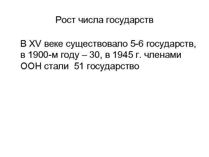 Рост числа государств В XV веке существовало 5 -6 государств, в 1900 -м году – 30, в 1945 г. членами ООН стали 51 государство