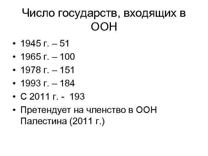 Число государств, входящих в ООН • • • 1945 г. – 51 1965 г. – 100 1978 г. – 151 1993 г. – 184 С 2011 г. - 193 Претендует на членство в ООН Палестина (2011 г. )