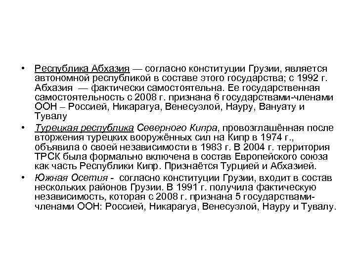 • Республика Абхазия — согласно конституции Грузии, является автономной республикой в составе этого государства; с 1992 г. Абхазия — фактически самостоятельна. Ее государственная самостоятельность c 2008 г. признана 6 государствами-членами ООН – Россией, Никарагуа, Венесуэлой, Науру, Вануату и Тувалу • Турецкая республика Северного Кипра, провозглашённая после вторжения турецких вооружённых сил на Кипр в 1974 г. , объявила о своей независимости в 1983 г. В 2004 г. территория ТРСК была формально включена в состав Европейского союза как часть Республики Кипр. Признаётся Турцией и Абхазией. • Южная Осетия - согласно конституции Грузии, входит в состав нескольких районов Грузии. В 1991 г. получила фактическую независимость, которая с 2008 г. признана 5 государствамичленами ООН: Россией, Никарагуа, Венесуэлой, Науру и Тувалу.