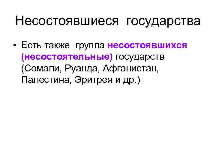 Несостоявшиеся государства • Есть также группа несостоявшихся (несостоятельные) государств (Сомали, Руанда, Афганистан, Палестина, Эритрея и др. )