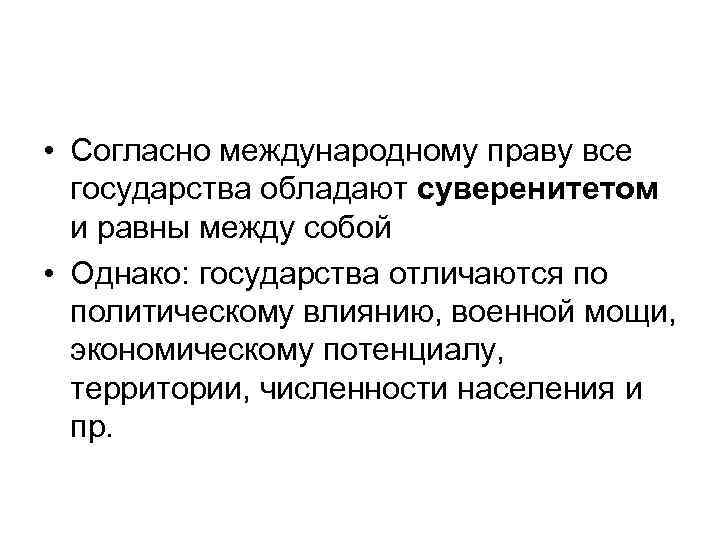 • Согласно международному праву все государства обладают суверенитетом и равны между собой • Однако: государства отличаются по политическому влиянию, военной мощи, экономическому потенциалу, территории, численности населения и пр.