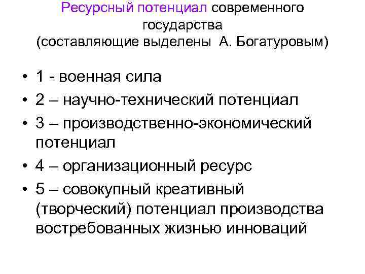 Ресурсный потенциал современного государства (составляющие выделены А. Богатуровым) • 1 - военная сила • 2 – научно-технический потенциал • 3 – производственно-экономический потенциал • 4 – организационный ресурс • 5 – совокупный креативный (творческий) потенциал производства востребованных жизнью инноваций