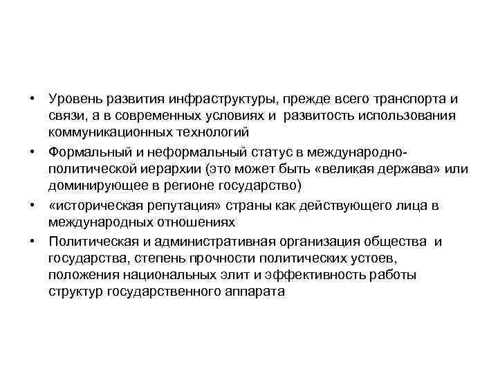 • Уровень развития инфраструктуры, прежде всего транспорта и связи, а в современных условиях и развитость использования коммуникационных технологий • Формальный и неформальный статус в международнополитической иерархии (это может быть «великая держава» или доминирующее в регионе государство) • «историческая репутация» страны как действующего лица в международных отношениях • Политическая и административная организация общества и государства, степень прочности политических устоев, положения национальных элит и эффективность работы структур государственного аппарата
