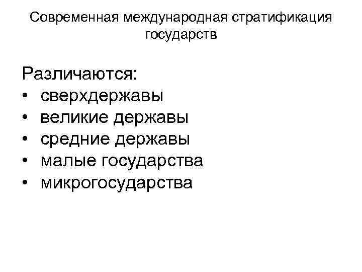 Современная международная стратификация государств Различаются: • сверхдержавы • великие державы • средние державы • малые государства • микрогосударства