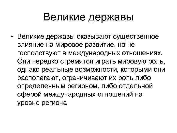 Великие державы • Великие державы оказывают существенное влияние на мировое развитие, но не господствуют в международных отношениях. Они нередко стремятся играть мировую роль, однако реальные возможности, которыми они располагают, ограничивают их роль либо определенным регионом, либо отдельной сферой международных отношений на уровне региона