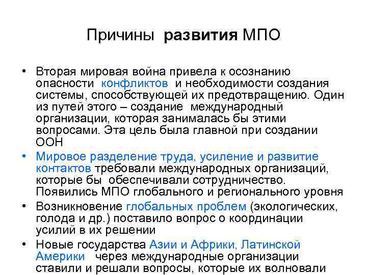 Причины развития МПО • Вторая мировая война привела к осознанию опасности конфликтов и необходимости создания системы, способствующей их предотвращению. Один из путей этого – создание международный организации, которая занималась бы этими вопросами. Эта цель была главной при создании ООН • Мировое разделение труда, усиление и развитие контактов требовали международных организаций, которые бы обеспечивали сотрудничество. Появились МПО глобального и регионального уровня • Возникновение глобальных проблем (экологических, голода и др. ) поставило вопрос о координации усилий в их решении • Новые государства Азии и Африки, Латинской Америки через международные организации ставили и решали вопросы, которые их волновали