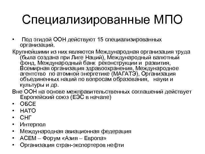 Специализированные МПО • Под эгидой ООН действуют 15 специализированных организаций. Крупнейшими из них являются Международная организация труда (была создана при Лиге Наций), Международный валютный фонд, Международный банк реконструкции и развития, Всемирная организация здравоохранения, Международное агентство по атомной энергетике (МАГАТЭ), Организация объединенных наций по вопросам образования, науки и культуры и др. Вне ООН на основе межправительственных соглашений действует Европейский союз (ЕЭС в начале) • ОБСЕ • НАТО • СНГ • Интерпол • Международная авиационная федерация • ACEM – Форум «Азия – Европа» • Организация стран-экспортеров нефти