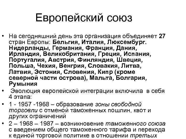 Европейский союз • На сегодняшний день эта организация объединяет 27 стран Европы: Бельгия, Италия, Люксембург. Нидерланды, Германия, Франция, Дания, Ирландия, Великобритания, Греция, Испания, Португалия, Австрия, Финляндия, Швеция, Польша, Чехия, Венгрия, Словакия, Литва, Латвия, Эстония, Словения, Кипр (кроме северной части острова), Мальта, Болгария, Румыния • Эволюция европейской интеграции включила в себя 4 этапа: • 1 - 1957 -1968 – образование зоны свободной торговли с отменой таможенных пошлин, квот и других ограничений • 2 – 1968 – 1987 – возникновение таможенного союза с введением общего таможенного тарифа и перехода к единой торговой политике в отношении третьих