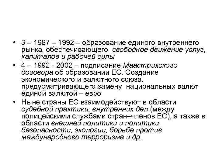 • 3 – 1987 – 1992 – образование единого внутреннего рынка, обеспечивающего свободное движение услуг, капиталов и рабочей силы • 4 – 1992 - 2002 – подписание Маастрихского договора об образовании ЕС. Создание экономического и валютного союза, предусматривающего замену национальных валют единой валютой – евро • Ныне страны ЕС взаимодействуют в области судебной практики, внутренних дел (между полицейскими службами стран–членов ЕС), а также в области внешней политики и политики безопасности, экологии, борьбе против международного терроризма и др.