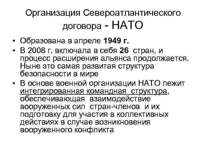 Организация Североатлантического договора - НАТО • Образована в апреле 1949 г. • В 2008 г. включала в себя 26 стран, и процесс расширения альянса продолжается. Ныне это самая развитая структура безопасности в мире • В основе военной организации НАТО лежит интегрированная командная структура, обеспечивающая взаимодействие вооруженных сил стран-членов и их подготовку для участия в коллективных действиях в случае возникновения вооруженного конфликта