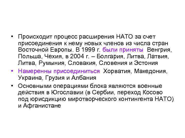 • Происходит процесс расширения НАТО за счет присоединения к нему новых членов из числа стран Восточной Европы. В 1999 г. были приняты Венгрия, Польша, Чехия, в 2004 г. – Болгария, Литва, Латвия, Литва, Румыния, Словакия, Словения и Эстония • Намеренны присоединиться Хорватия, Македония, Украина, Грузия и Албания • Основными операциями блока являются военные действия в Югославии (в Сербии, переход Косово под юрисдикцию миротворческого контингента НАТО) и Афганистане