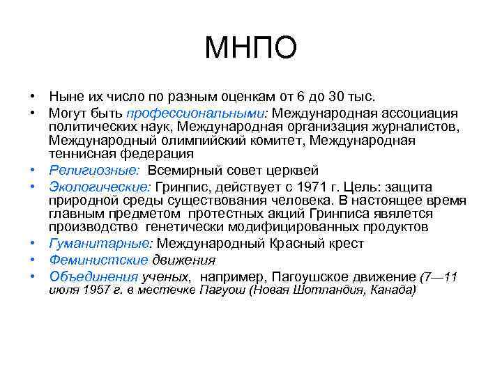 МНПО • Ныне их число по разным оценкам от 6 до 30 тыс. • Могут быть профессиональными: Международная ассоциация политических наук, Международная организация журналистов, Международный олимпийский комитет, Международная теннисная федерация • Религиозные: Всемирный совет церквей • Экологические: Гринпис, действует с 1971 г. Цель: защита природной среды существования человека. В настоящее время главным предметом протестных акций Гринписа явялется производство генетически модифицированных продуктов • Гуманитарные: Международный Красный крест • Феминистские движения • Объединения ученых, например, Пагоушское движение (7— 11 июля 1957 г. в местечке Пагуош (Новая Шотландия, Канада)