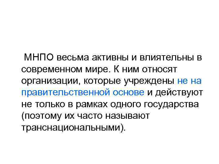 МНПО весьма активны и влиятельны в современном мире. К ним относят организации, которые учреждены не на правительственной основе и действуют не только в рамках одного государства (поэтому их часто называют транснациональными).