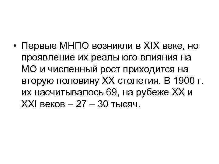 • Первые МНПО возникли в XIX веке, но проявление их реального влияния на МО и численный рост приходится на вторую половину ХХ столетия. В 1900 г. их насчитывалось 69, на рубеже ХХ и XXI веков – 27 – 30 тысяч.