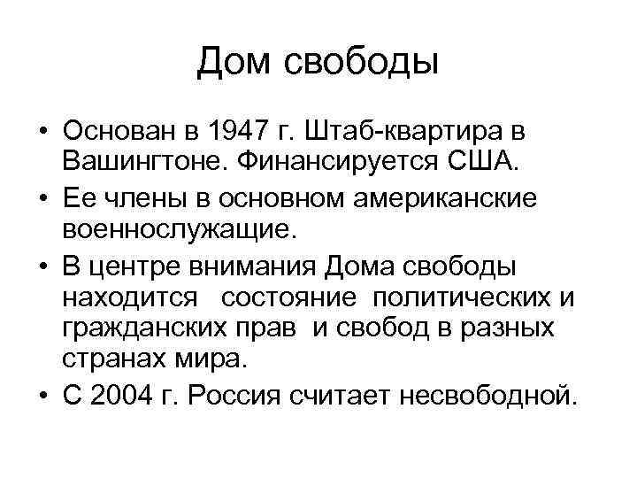 Дом свободы • Основан в 1947 г. Штаб-квартира в Вашингтоне. Финансируется США. • Ее члены в основном американские военнослужащие. • В центре внимания Дома свободы находится состояние политических и гражданских прав и свобод в разных странах мира. • С 2004 г. Россия считает несвободной.