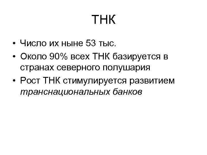 ТНК • Число их ныне 53 тыс. • Около 90% всех ТНК базируется в странах северного полушария • Рост ТНК стимулируется развитием транснациональных банков