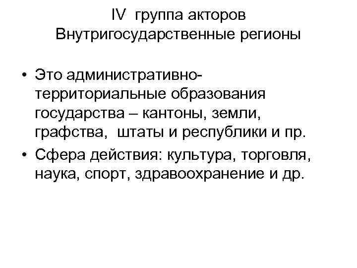 IV группа акторов Внутригосударственные регионы • Это административнотерриториальные образования государства – кантоны, земли, графства, штаты и республики и пр. • Сфера действия: культура, торговля, наука, спорт, здравоохранение и др.