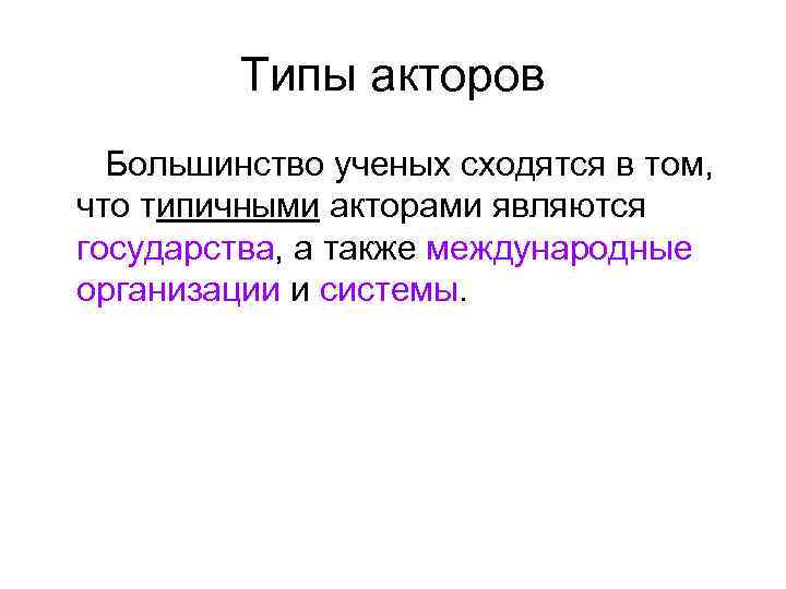 Типы акторов Большинство ученых сходятся в том, что типичными акторами являются государства, а также международные организации и системы.