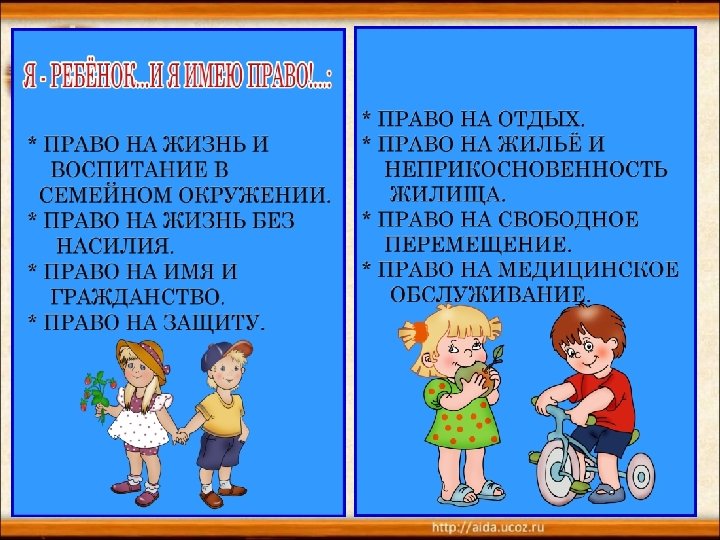 Сокращенный перечень прав ребёнка (приводится по Конвенции о правах ребёнка) • • • • • Статья 2. У всех детей равные права независимо от национальности, пола, религиозных или политических убеждений. Статья 6. Право на жизнь. Выживание и свободное развитие. Статья 8. Право на сохранение своей индивидуальности. Статья 9. Право на общение с обоими родителями. Статья 12 и 13. Право свободно выражать свои взгляды и мнения. Статья 14. Право исповедовать любую религию. Статья 15. Право на свободу ассоциации и мирных собраний. Статья 16. Право на защиту от посягательства на личную жизнь, тайну переписки, честь и репутацию. Статья 17. Право на доступ к информации. Статья 19. Право на защиту от всех форм насилия. Статья 27. Право на достойный уровень жизни. Статья 28. Право на образование. Статья 31. Право на отдых и досуг. Статья 32. Право на защиту от экономической эксплуатации и выполнения опасной для жизни работы. Статья 37. Право на защиту от жестокого обращения. Статья 38. Дети, не достигшие 15 -летнего возраста, не должны участвовать в военных действиях. Статья 40. Право на гуманное обращение с детьми при нарушении ими закона.