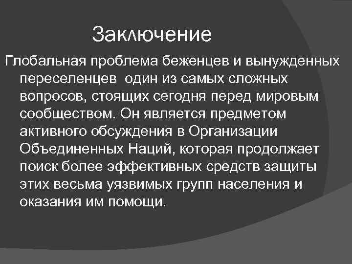 Заключение Глобальная проблема беженцев и вынужденных переселенцев один из самых сложных вопросов, стоящих сегодня перед мировым сообществом. Он является предметом активного обсуждения в Организации Объединенных Наций, которая продолжает поиск более эффективных средств защиты этих весьма уязвимых групп населения и оказания им помощи.
